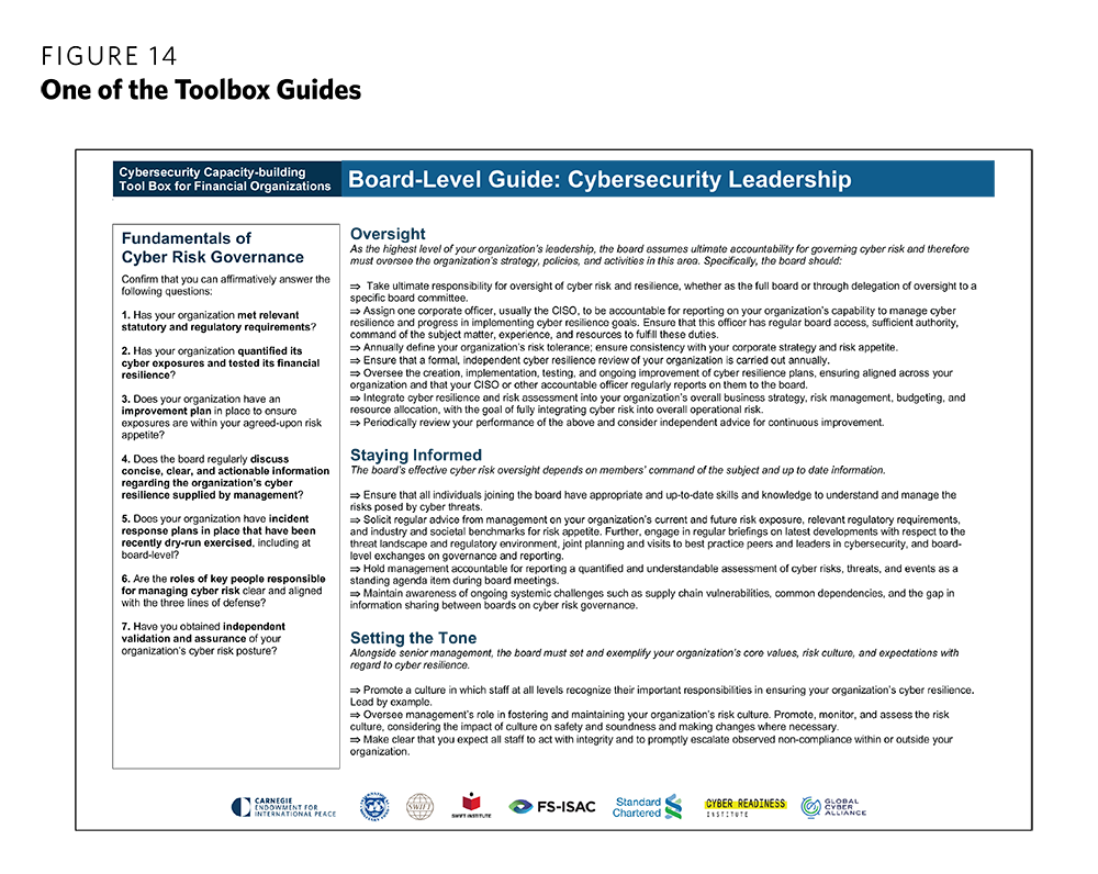 6 FinCyber Project, “Cyber Resilience and Financial Organizations: A Capacity-building Tool Box,” Carnegie Endowment for International Peace, https://carnegieendowment.org/specialprojects/fincyber/guides.