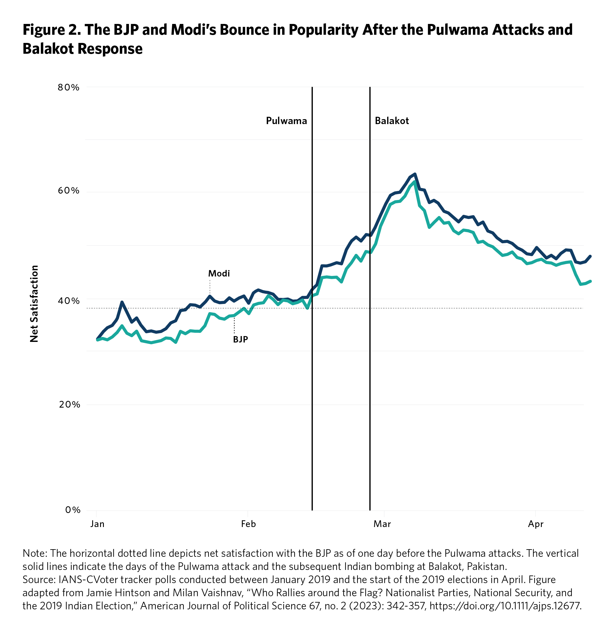 According to polling data from the Indo-Asian News Service and CVoter, satisfaction with the BJP central government had a 15-percentage-point bump in the weeks following the attacks in Pulwama and Balakot before partially reverting (see figure 2). A Lokniti-CSDS survey found that roughly 80 percent of voters in the 2019 general election had heard of the Balakot airstrike—46 percent of whom favored Modi’s reelection, compared to 32 percent among those unaware of India’s retaliatory strikes.